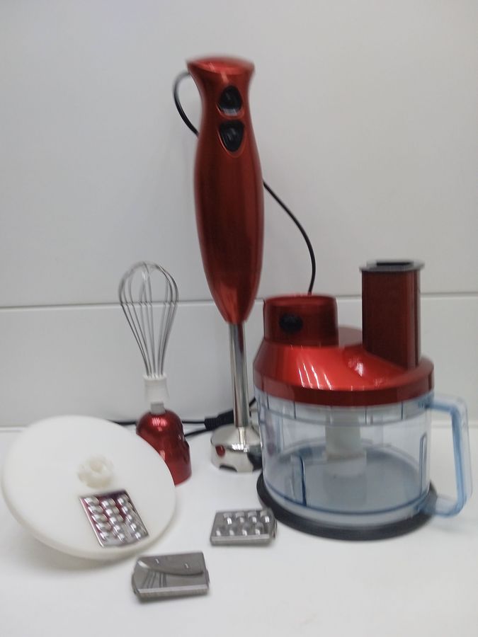 В комплект входить упаковка, три терки, ємкість для подрібнення продуктів та сам погружной блендер.