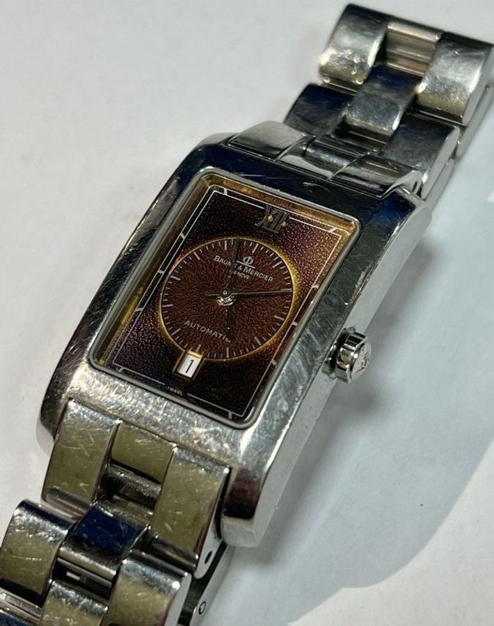 Модель Hampton від Baume&Mercier. Прямокутний корпус 41х25 мм. Автоматичний механізм. Не значні потертості, які не впливають на загальний стан та роботу