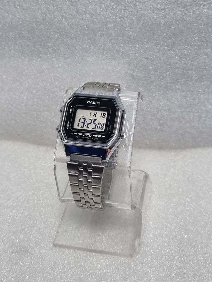Електронний годинник Casio LA680WEA-1EF — компактна класична модель у ретро-стилі, що поєднує впізнаваний дизайн Casio та практичну функціональність на щодень. Кварцовий механізм забезпечує стабільну точність ходу, а цифровий дисплей відображає години, хвилини, секунди, а також дату й день тижня, що зручно в повсякденному використанні. Вбудоване підсвічування допомагає зчитувати показники в темряві, секундомір з точністю до 1/100 секунди та щоденний будильник стануть у пригоді для спорту, навчання й роботи. Функція автоматичного календаря звільняє від необхідності вручну коригувати дату, а формат часу 12/24 години дозволяє обрати звичний спосіб відображення. Корпус годинника виготовлено з легкого полімерного матеріалу, сталевий браслет із регульованою застібкою надійно фіксує годинник на зап’ясті й пасує до тонкої руки. Водонепроникність рівня, достатнього для захисту від бризок та дощу, робить модель зручною для щоденного міського носіння, при цьому не рекомендується плавати в цьому годиннику. LA680WEA-1EF особливо популярна серед поціновувачів вінтажної естетики та мінімалістичних аксесуарів, а завдяки простоті конструкції й надійності Casio така модель, зокрема в акуратно вживаному стані, може довго залишатися функціональним і актуальним аксесуаром.