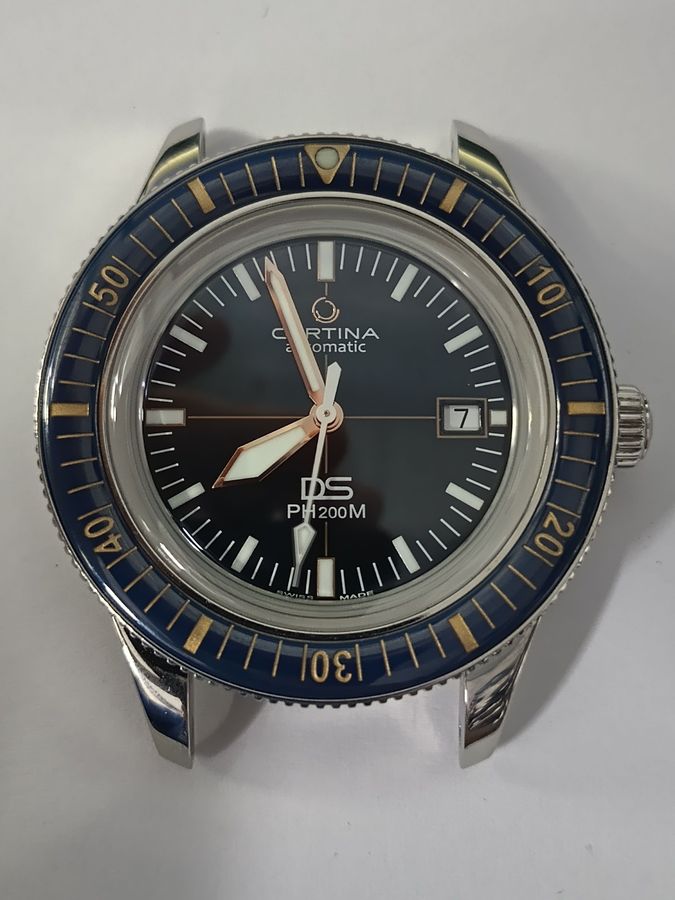 Модель DS PH200m від Certina. Вперше з`явившись у 1967 році ця модель довела, що годинник для дайвінгу повинен бути не тільки водонепроникним, але й стильним. Механізм Powermatic 80 із запасом ходу 80 годин. Стійкий до подряпин керамічний безіль. DS – double security – система подвійної безпеки розроблена компанією Certina. PH200m Pression Hydrostatique - гідростатичний тиск 200 метрів, здатність годинника зберігати герметичність до 200 метрів.