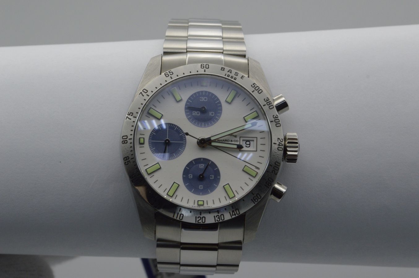 Хронограф Champion від Eberhard & Co. Спортивний чоловічий хронограф на основі легендарного калібру ETA-7750. Корпус із нержавіючої сталі, сапфірове скло, безель з тахіметричною шкалою. Стан нового.