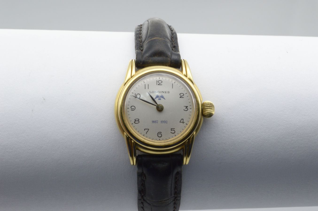 Жіночий годинник від Longines випущений до 125-річного ювілею марки. Механізм механічний із ручним заводом. Корпус позолочений. Діаметр корпусу 25 мм.
