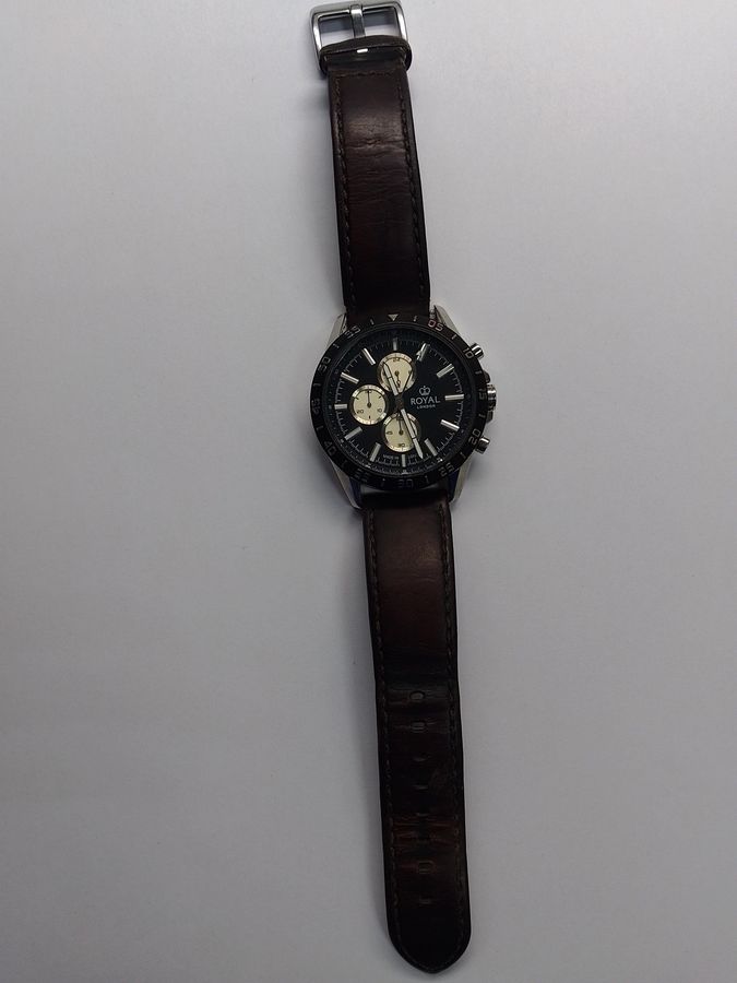 Чоловічі наручні годинники Royal London моделі 41411-01 у класичному чорному кольорі. Модель відрізняється строгим дизайном з чіткими арабськими цифрами на циферблаті та зручним шкіряним ремінцем. Цей екземпляр знаходиться у хорошому робочому стані, усі функції годинника (хід, індикація часу) працюють коректно. На корпусі та склі присутні незначні сліди щоденного носіння, характерні для б/в аксесуарів, які не впливають на загальне сприйняття та функціональність. Годинники готові до подальшої експлуатації та не потребують втручання. Це надійний та стильний аксесуар для повсякденного використання.