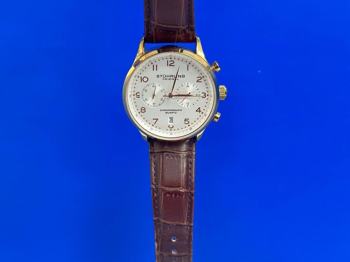 Чоловічий годинник Stuhrling Original Monaco Chronograph 4012.4 — це сучасний кварцовий хронограф, що поєднує класичний європейський дизайн із доступною ціною. Модель вирізняється корпусом кольору «рожеве золото», білим циферблатом та коричневим шкіряним ремінцем. +3Основні характеристикиЗгідно з даними Watch Gang та Tata CLiQ Luxury, модель має такі специфікації:Механізм: Японський кварцовий хронограф.Корпус: Діаметр 42 мм, виготовлений із нержавіючої сталі з PVD-покриттям кольору Rose Gold.Скло: Мінеральне або Krysterna (фірмове стійке до подряпин скло Stuhrling). Деякі регіональні ритейлери зазначають сапфірове скло, проте офіційні специфікації частіше вказують мінеральне.Функції: Хронограф (секунди, 30-хвилинний лічильник), 24-годинна індикація, дата та тахіметрична шкала.Водозахист: 5 ATM (50 метрів), що дозволяє витримувати бризки та короткочасне занурення.Ремінець: Натуральна теляча шкіра коричневого кольору з тисненням під алігатора, ширина 22 мм.