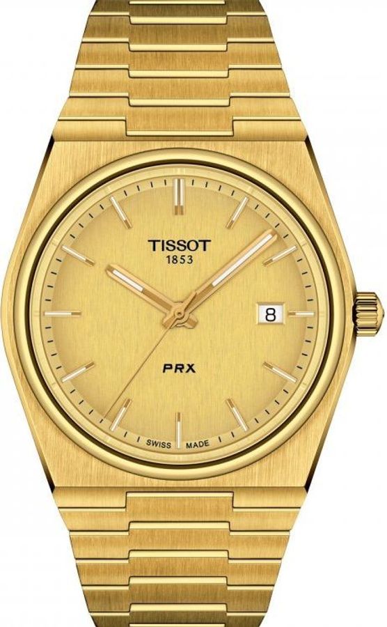 Годинник Tissot PRX T137.410.33.021.00 — це швейцарська кварцова модель з характерним для колекції PRX дизайном кінця 1970‑х років та інтегрованим браслетом. Корпус діаметром 40 мм виготовлений із неіржавної сталі 316L з покриттям PVD жовтого кольору, яке надає годиннику стійкий золотистий відтінок і додатково захищає метал від зносу. Сапфірове скло з підвищеною стійкістю до подряпин надійно закриває циферблат золотистого відтінку з поздовжнім сатинуванням, стрілками та накладними мітками з люмінесцентним покриттям для зручного зчитування часу в умовах недостатнього освітлення. Усередині встановлено швейцарський кварцовий механізм ETA F06.115 із датою в положенні «3 година» та індикатором завершення ресурсу батарейки (EOL), що дозволяє вчасно запланувати її заміну. Водозахист до 100 м робить модель придатною для щоденного носіння, занять спортом і відпочинку біля води без занурень з аквалангом. Сталевий браслет із покриттям PVD та розкладною застібкою з кнопками забезпечує надійну фіксацію на зап’ясті. Годинник пасує до повсякденного й офісного стилю, а також до ділових поїздок, а варіант б/в дає змогу отримати всі переваги швейцарської моделі за більш доступною ціною за умови належного стану екземпляра.