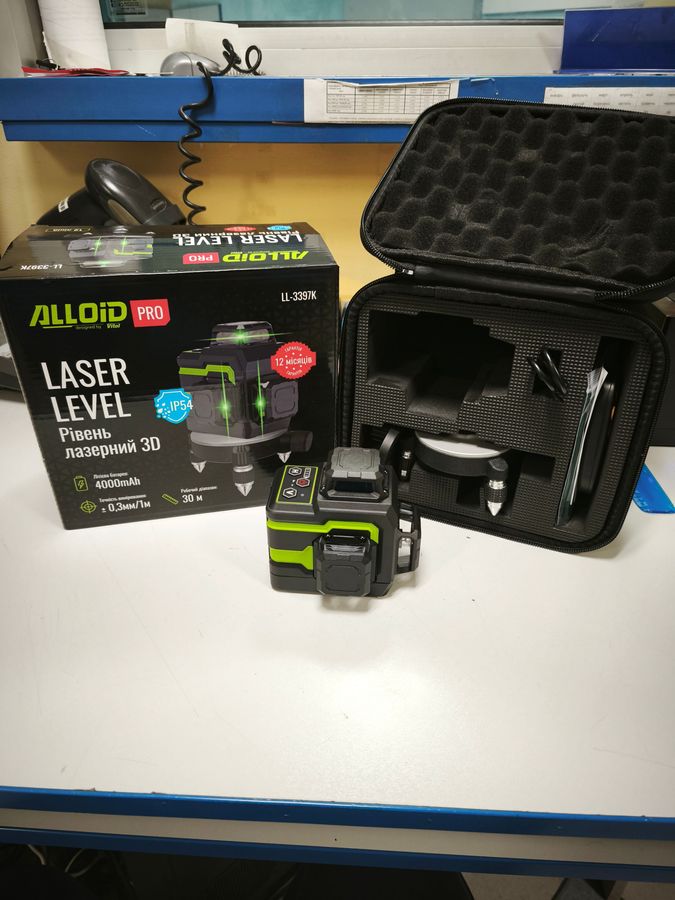 Лазерний рівень у ідеальному новому стані, повністю робочий без слідів використання, без дефектів, повна комплектація.