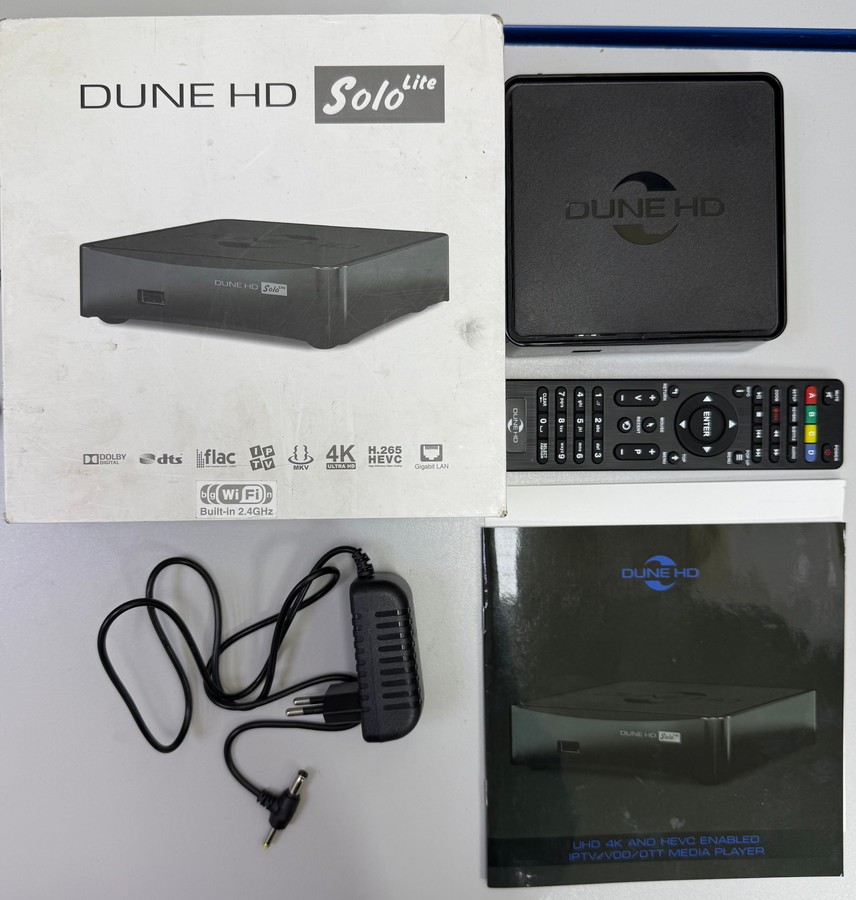 Медіаплеєр Dune HD Solo Lite — компактний та надійний пристрій для відтворення мультимедіа. Ця модель відома стабільною роботою та підтримкою широкого спектру форматів відео, аудіо та зображень. Конкретно ця позиція знаходиться у стані, не відмінному від нового, без будь-яких дефектів. Корпус чорного кольору зберіг свій первісний вигляд. Пристрій готовий до використання та повністю функціональний. До комплекту входить оригінальний пульт дистанційного керування, мережевий кабель та інструкція, що дозволяє одразу розпочати перегляд фільмів чи прослуховування музики з різних носіїв або по мережі.