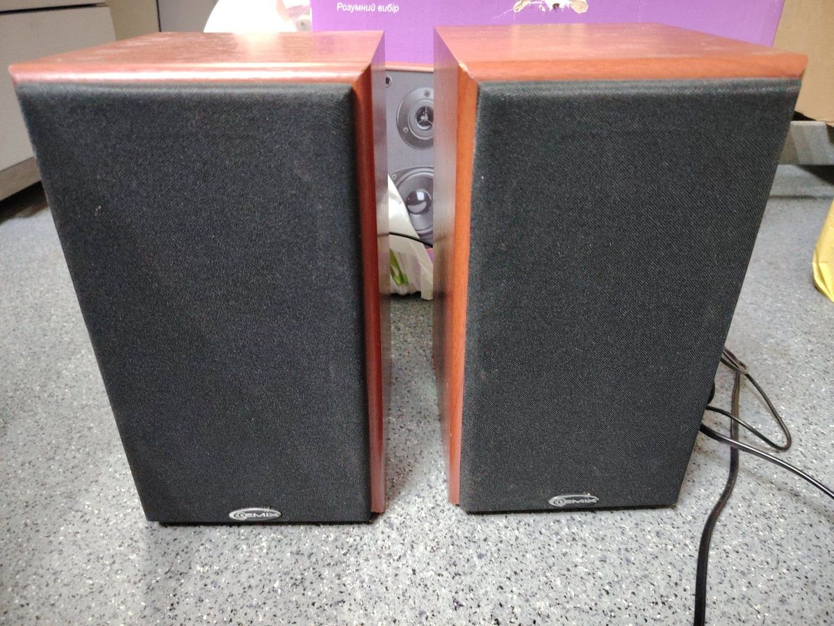 Звучання відмінне. Є невеликі сколи шпону внизу. У комплекті коробка та всі необхідні шнури.