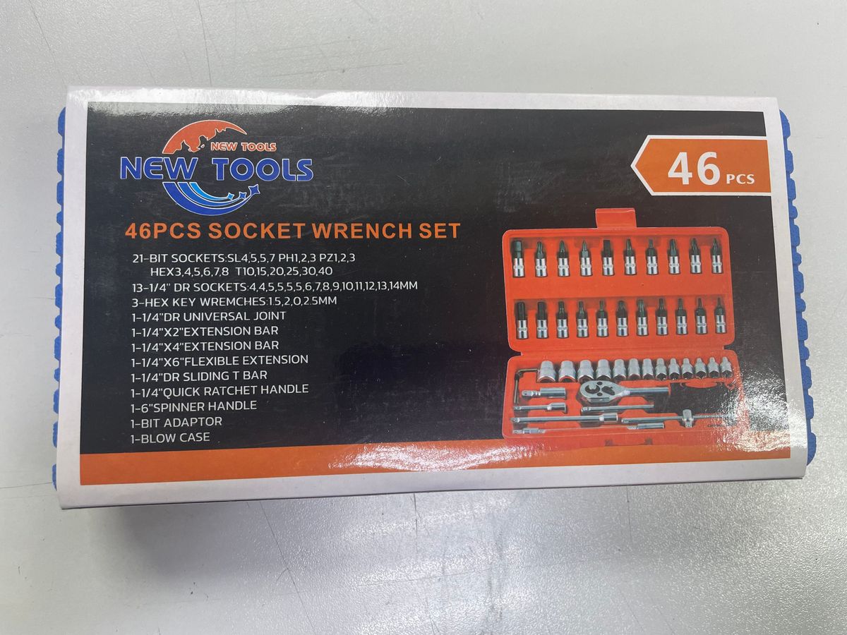 Набір автомобільних інструментів New Tools на 46 предметів у повній комплектації. Інструменти перебувають у стані нового товару, без слідів експлуатації. Включає широкий асортимент насадок для різноманітних робіт з автомобілем, укомплектованих у зручну сумку для зберігання та перенесення. Колір інструментів — синьо-блакитний. Повний комплект, готовий до використання. Ідеальний варіант для домашнього майстра, який шукає готовий набір для базового ремонту та обслуговування автомобіля.