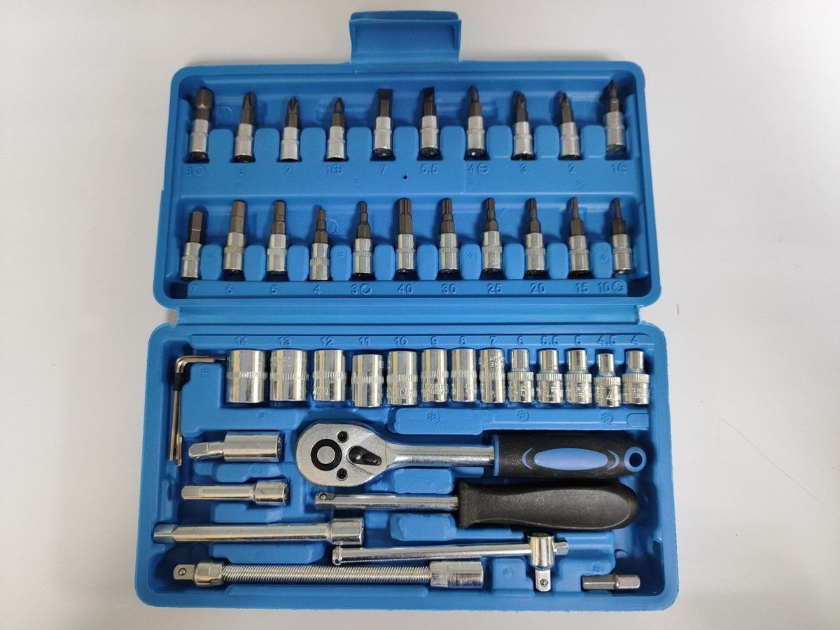 Набір автомобільних інструментів New Tools на 46 предметів – це готове рішення для базового ремонту та обслуговування автомобіля. Комплект включає найбільш затребувані інструменти: гайкові ключі (рожкові та накидні), викрутки з різними насадками, пасатижі, молоток та інші елементи. Усі предмети акуратно розміщені в міцному пластиковому кейсі з фіксаторами, що забезпечує порядок та зручність зберігання. Інструменти перебувають у стані, близькому до нового, без видимих слідів інтенсивного використання, сколів або корозії. Метал зберіг заводську міцність, а рукоятки не мають пошкоджень. Цей набір стане чудовим базовим арсеналом для виконання стандартних операцій: заміни коліс, підтягування кріплення, дрібного ремонту в дорозі чи гаражі.