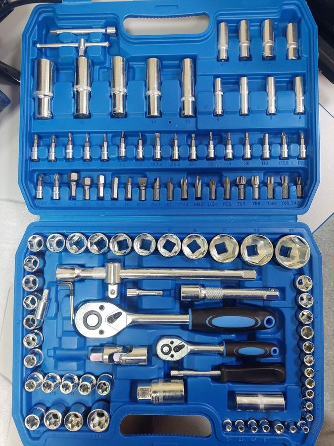 Набір автомобільних інструментів New Tools на 108 предметів — це готове рішення для більшості ремонтних та сервісних робіт. Модель відрізняється продуманою комплектацією: тут є торцеві головки різних розмірів, накидні та рожкові ключі, викрутки, пасатижі та інші необхідні інструменти в міцному кейсі. Саме цей набір має відмінний зовнішній вигляд, без видимих слідів інтенсивного використання, корпус кейсу та самі інструменти не мають пошкоджень. Комплектація повна, всі інструменти на місці. Це надійний і готовий до роботи комплект для домашнього гаражу або професійного використання.