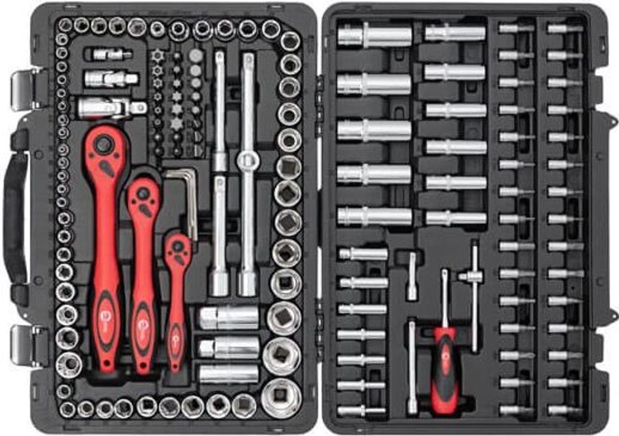 - Комплектація набору ручного: набір біт, тримач для біт, карданні шарніри, свічні головки, торцеві головки, тріскачка, подовжувач, шестигранні/зіркоподібні ключі