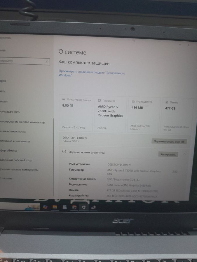 Характеристики Ноутбук Acer 15/ryzen 5 7520u ddr5/8gb ddr5/ssd 500 gb/*інтегрована: