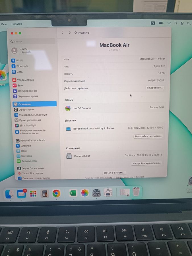 Характеристики Ноутбук Apple macbook air 13.6/ m2 / ram 16gb/ ssd 256gb/ gpu 8 core: