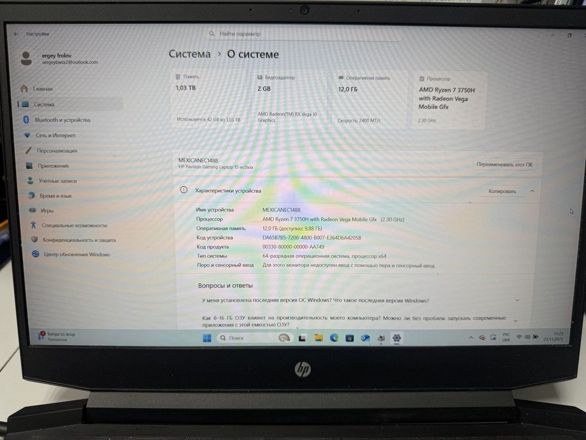 Hp 15/ryzen 7 3750h ddr4/16gb ddr4/ssd 1000 gb/*інтегрована