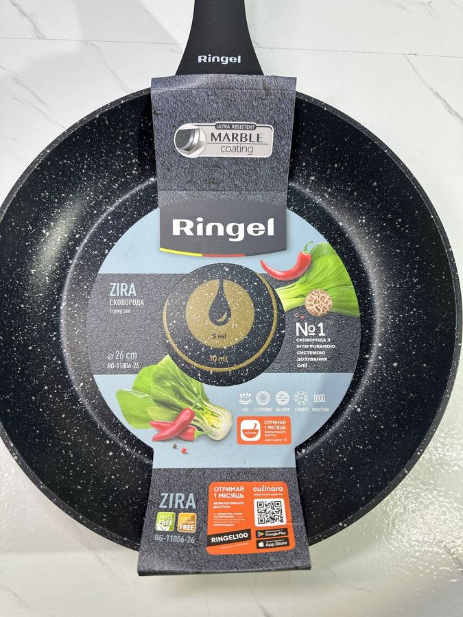 Сковорідка Ringel Zira 26 см (RG-11006-26) – універсальна класична пательня з кованого алюмінію, розроблена для щоденного приготування та розігріву різноманітних страв. Діаметр 26 см, висота борта 4,8 см і товщина стінок 3,2 мм забезпечують швидкий та рівномірний нагрів по всій поверхні, що зменшує ризик пригорання їжі. Багатошарове антипригарне покриття Marble дозволяє готувати з мінімальною кількістю олії, не містить PFOA та значно полегшує очищення, включно з миттям у посудомийній машині. Сковорідка сумісна з усіма типами плит, зокрема індукційними, завдяки спеціальному індукційному диску в дні, що робить її практичним рішенням для будь-якої кухні. Ергономічна бакелітова ручка з покриттям soft-touch не нагрівається, не ковзає в руці й забезпечує комфортне та безпечне користування. Поточний стан саме цього екземпляра – ідеальний, слідів використання