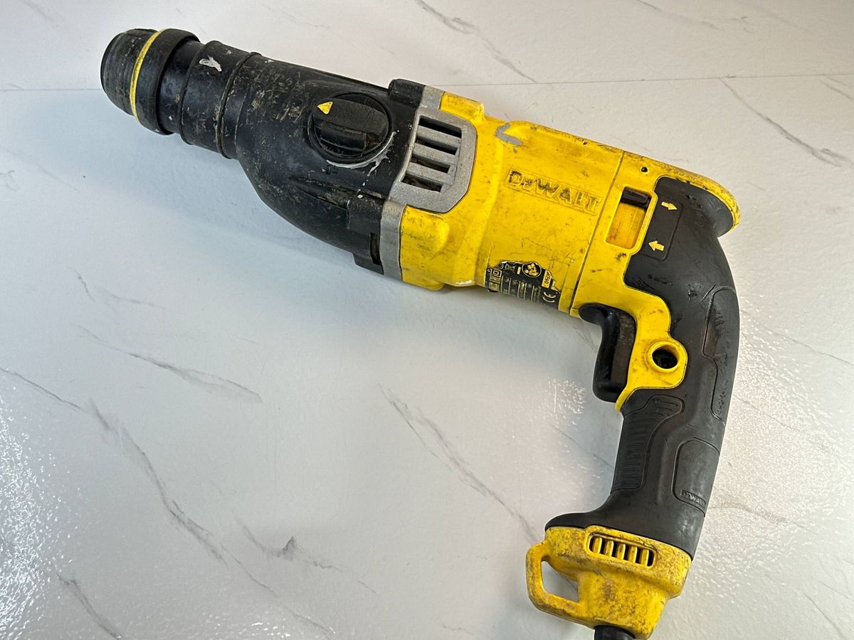 DeWalt D25143K – потужний мережевий перфоратор SDS-Plus 900 Вт із трьома режимами роботи (свердління, свердління з ударом, довбання), розрахований для інтенсивних завдань у бетоні, цеглі та камені. Енергія удару до 3 Дж, частота до 5350 уд/хв і швидкість обертання до 1450 об/хв забезпечують швидке свердління отворів діаметром до 28 мм у бетоні та до 30 мм у деревині, а ергономічний корпус і система зниження вібрації підвищують комфорт під час тривалої роботи. Модель оснащена реверсом, обмежувачем глибини буріння та бічною рукояткою, що робить її зручним інструментом як для професіоналів, так і для вимогливих домашніх майстрів. Даний екземпляр жовтого кольору має значни потертості/подряпини по корпусу, відсутня кнопка фіксації пуску, туго ходить перемикач реверсу, є потертості на корпусі, але основні функції удару й свердління працюють, інструмент придатний для виконання основних задач. Комплектація – без комплекту, лише сам перфоратор без кейса й аксесуарів