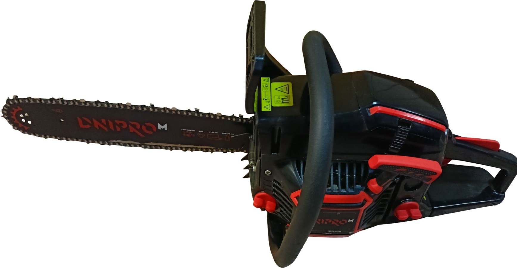 Пила ланцюгова Dnipro-M NSG-45H у відмінному зовнішньому стані. Модель відноситься до побутових ланцюгових пил, оснащена двигуном потужністю 2000 Вт та шиною 45 см. Підходить для валки невеликих дерев, обрізки гілок та заготівлі дров. Інструмент легкий (близько 4.5 кг), що зручно при тривалій роботі. Система швидкого натягу ланцюга дозволяє регулювати його без ключа. Автоматичне змащування ланцюга подовжує термін служби. Працює від мережі 220 В. Корпус виконаний з ударостійкого пластику. На рукоятці передбачений захист від випадкового запуску. Продається без комплекту постачання, лише пила. Гарантії немає. Стан відмінний, слідів експлуатації майже немає. Підійде для дачних робіт або невеликих завдань у приватному будинку.