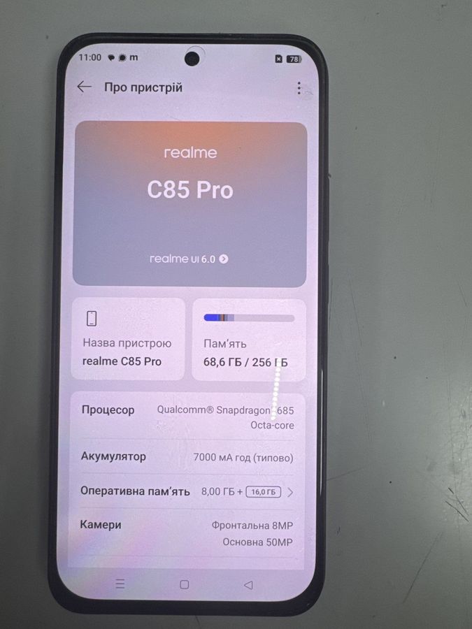 Смартфон Realme C85 Pro 8/256GB — практичне рішення для користувачів, яким потрібен надійний робочий та мультимедійний інструмент на кожен день. Повноекранний сенсорний дисплей зручний для перегляду відео, соціальних мереж і веб‑сторінок, а вбудований накопичувач обсягом 256 ГБ дозволяє зберігати значну кількість фотографій, музики, документів та застосунків без постійного звільнення пам’яті. Операційна система Android з фірмовою оболонкою Realme UI забезпечує доступ до магазину Google Play і широкого вибору сервісів для спілкування, навчання, роботи й розваг. Обсяг оперативної пам’яті 8 ГБ допомагає смартфону впевнено працювати в багатозадачному режимі, швидко перемикатися між кількома програмами та запускати більш вимогливі до ресурсів застосунки. Основна і фронтальна камери підходять для повсякденної зйомки, відеодзвінків і публікацій у соціальних мережах, забезпечуючи швидкий доступ до основних режимів і налаштувань. Підтримка мобільного зв’язку, Wi‑Fi, Bluetooth і супутникової навігації робить Realme C85 Pro зручним центром комунікацій удома, в офісі та в подорожах. Вбудований акумулятор розрахований на тривалу автономну роботу й допомагає залишатися на зв’язку протягом дня за типовим сценарієм використання. Для покупців вживаної техніки така модель може бути фінансово вигідним варіантом: характеристики 8/256 ГБ і надалі відповідають вимогам більшості сучасних застосунків, а під час придбання у відповідального продавця смартфон проходить перевірку та професійне очищення даних.