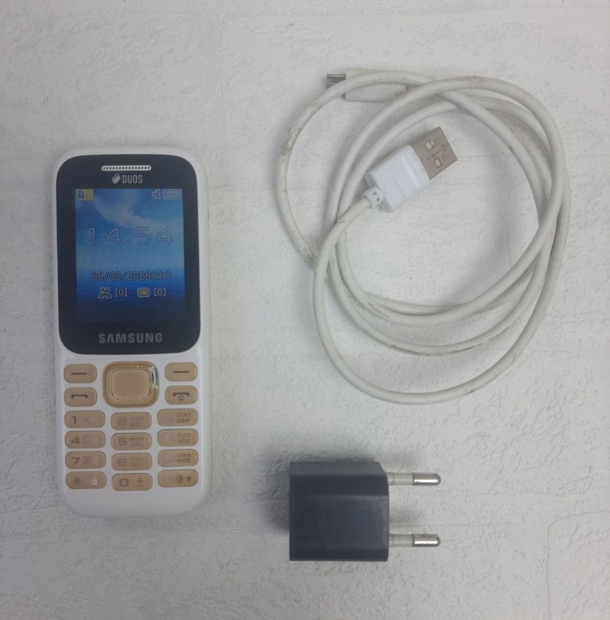Samsung B310E — класичний мобільний телефон у білому корпусі, який має помітні сліди використання. Це надійна модель для тих, хто цінує простоту та тривалу роботу від акумулятора. Цей примірник продається у неповній комплектації: в наявності лише зарядний