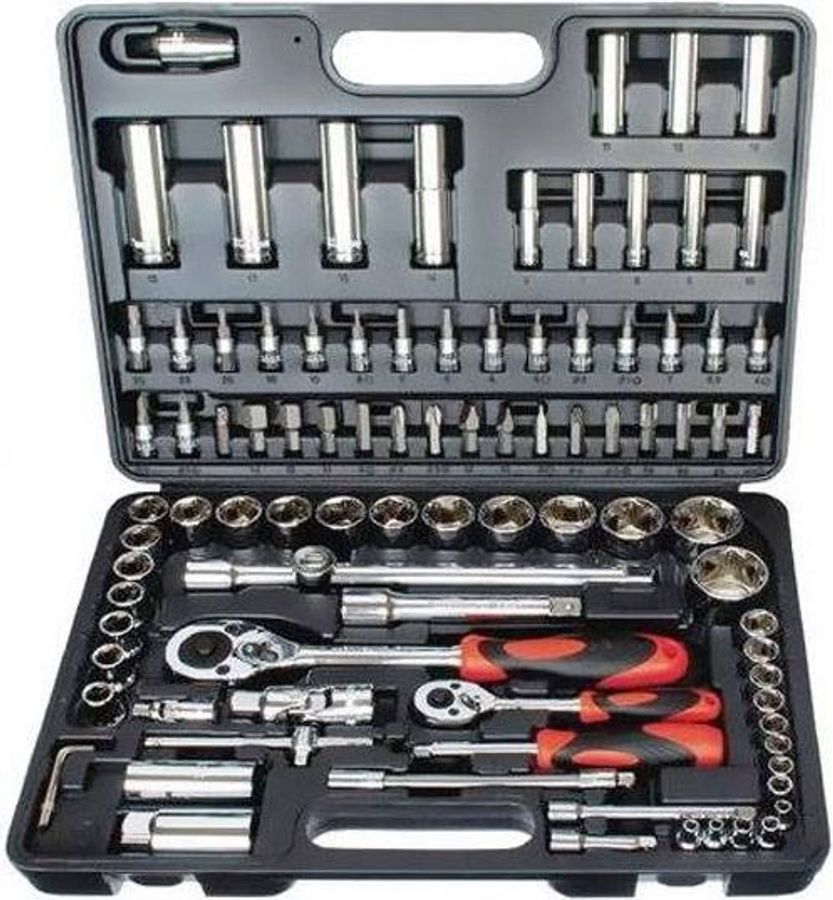 - Комплектация набора ручного: набор бит, держатель для бит, карданные шарниры, свечные головки, торцевые головки, трещотка, удлинитель