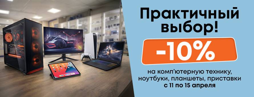 С 11 по 15 апреля (включительно) у нас действуют специальные условия на ноутбуки, планшеты, приставки и комплектующие. Выбирайте технику для работы, учебы или развлечений по максимально выгодной цене.