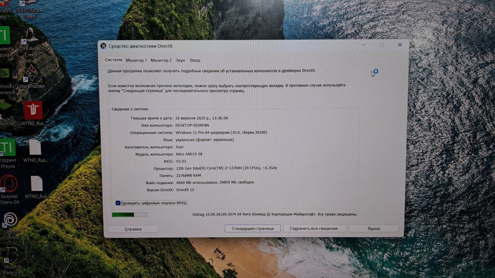 Ноутбук Acer 15/core i7-12700h ddr5/32gb ddr5/hdd *відсутній/ssd 512 gb/geforce rtx3050ti 4gb