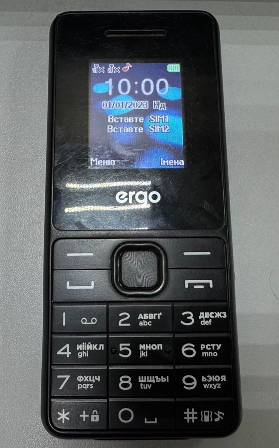 Смартфон Ergo E181 в черном цвете, бывший в использовании. Модель E181 — это классический функциональный телефон с базовыми возможностями связи. Данный экземпляр имеет заметные следы эксплуатации: на экране присутствуют потертости и мелкие царапины, которые могут быть видны при включенном дисплее. Кнопка включения фонарика не функционирует, что является основным дефектом устройства. Все остальные функции телефона, включая звонки, SMS, FM-радио и работу с двумя SIM-картами, работают исправно. Телефон продается без комплектации (зарядного устройства, кабеля и т.д.). Это рабочее решение для тех, кто ищет надежный и простой аппарат для основных задач связи.