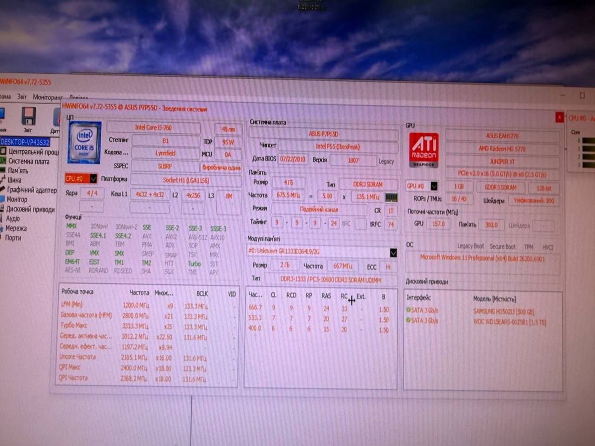 Характеристики intel core i5-760/ram 4 gb/hdd 500 gb/ssd відсутній/інтегрована: