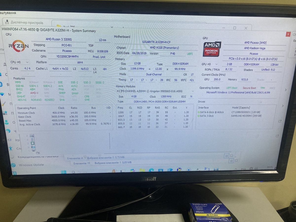 Пк amd ryzen 3 3200g/ram 12 gb/hdd 200 gb/ssd 120 gb/інтегрована