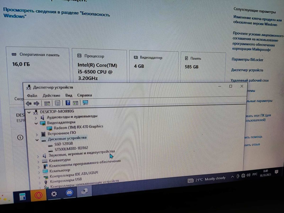 Характеристики intel core i5-6500/ram 16 gb/hdd 500 gb/ssd 128 gb/amd/ ati radeon rx 580 4gb gddr5 256bit: