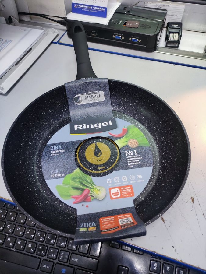 Сковорода Ringel Zira Wok 28 см (RG-11006-28W) призначена для швидкого обсмажування та тушкування продуктів на побутових плитах, при цьому висока напівсферична форма й діаметр 28 см створюють оптимальні умови для приготування страв у стилі вок. Глибокі стінки дозволяють вільно перемішувати овочі, м’ясо, рибу чи локшину, зменшуючи ризик випадання інгредієнтів і розбризкування олії. Антипригарне покриття сприяє готуванню з меншою кількістю жиру та спрощує догляд: продукти менше пригорають, а внутрішню поверхню легше відмити вручну м’якими неабразивними засобами. Зручна подовжена ручка забезпечує надійний хват і дає змогу активно струшувати сковороду, рівномірно розподіляючи тепло й соус по вмісту. Конструкція розрахована на щоденне домашнє використання, тому модель підходить як для класичного смаження, так і для приготування рагу, соусів або швидких овочевих гарнірів. Сковорода буде корисною тим, хто опановує азійську кухню, а також тим, кому важливо швидко готувати невеликі порції із збереженням текстури та соковитості продуктів. Під час купівлі Ringel Zira Wok 28 см у стані б/в варто оцінити цілісність антипригарного шару й надійність кріплення ручки; за збереженої робочої поверхні така сковорода здатна виконувати ті самі завдання, що й нова, але з помітною економією бюджету та більш раціональним використанням ресурсів.