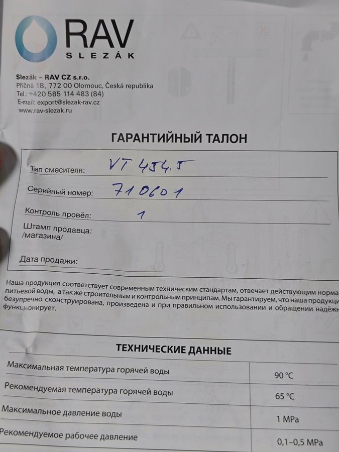 Характеристики Змішувач Rav Slezak vt 4545: