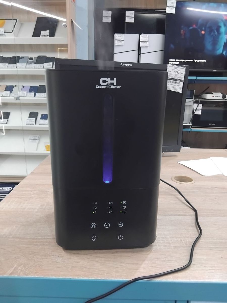 Зволожувач повітря Cooper&Hunter CH-2945T MAUI — це стильний та функціональний пристрій для створення комфортного мікроклімату в приміщенні. Модель CH-2945T відрізняється сучасним дизайном у чорному кольорі та оснащена ультразвуковою технологією зволоження, яка ефективно та безшумно насичує повітря вологою. Цей екземпляр перебуває у відмінному зовнішньому стані, без видимих пошкоджень, подряпин або потертостей. Пристрій підтримує кілька режимів роботи та регулювання інтенсивності випаровування, що дозволяє точно налаштувати рівень вологості під ваші потреби. Вбудований гігростат допомагає підтримувати задані параметри автоматично. Резервуар для води має достатній об`єм для тривалої роботи без доливання. Цей б/в зволожувач повітря готовий до використання та стане надійним помічником у підтримці здорового клімату у вашому домі або офісі.